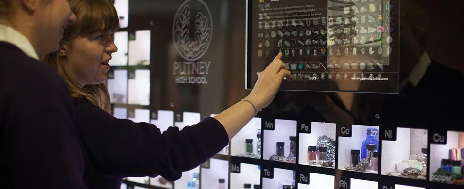 [[The periodic table display at Putney High School in London, UK stands by the library. Its imposing oak case matches the interior design and is filled with brightly lit samples and topped by an interactive touchscreen display as well as the School Crest. The display catches the eye of passing pupils and teachers alike. “There’s some jealousy from other departments!” says Dr Will Dixon, head of science at the school, with a laugh.///La tabla periódica en Putney High School en Londres, Reino Unido, está ubicada frente a la biblioteca. Su imponente carcasa de roble hace juego con el diseño del edificio, y está lleno de muestras brillantemente iluminadas, y coronada con una pantalla táctil interactiva, así como el grabado del emblema de la institución. El expositor llama la atención tanto de alumnos de paso como de profesores. “Hay un poco de celos en los otros departamentos!” dice con una risa el Dr. Will Dixon, jefe de ciencias en el colegio.]]