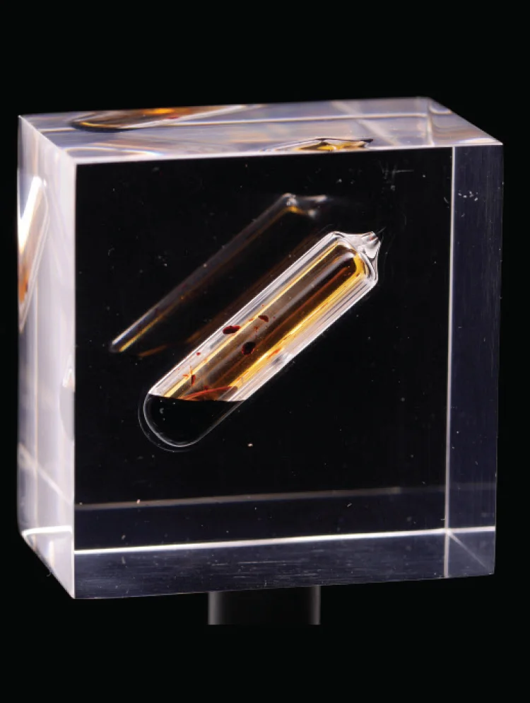 The alkali metal caesium, which becomes liquid if warmed in the hand, is one of the most reactive elements and explodes violently on contact with water. Here the sample is safely contained in a solid block of clear acrylic, which allows you to appreciate caesium’s beautiful pale golden colour.